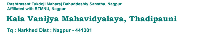 Welcome to Kala Vanijya Mahavidyalaya, Thadipauni, a milestone of academic excellence and co-curricular and extra- curricular performances which has enlarged and enriched in Maharashtra. Kala Vanijya Mahavidyalaya, Thadipauni was established on 24 Sept. 2009 . Kala Vanijya Mahavidyalaya, Thadipauni, is affiliated to the Rashtrasant Tukdoji Maharaj Nagpur University, Nagpur. We create a safe social and physical environment that helps all our students to learn and succeed. Our college has to privilege to have healthy and harmonious ambience and the credit goes to the blessings of our elite members of Governing Body and the diligence put in by learned teachers. This institutions has played a cascading role in the career and personality of innumerable students who have brought laurels to the college , state and country like college development cell staff council, Academic council. Moreover, discipline non – negotiable factor of a students life . ..........Continue